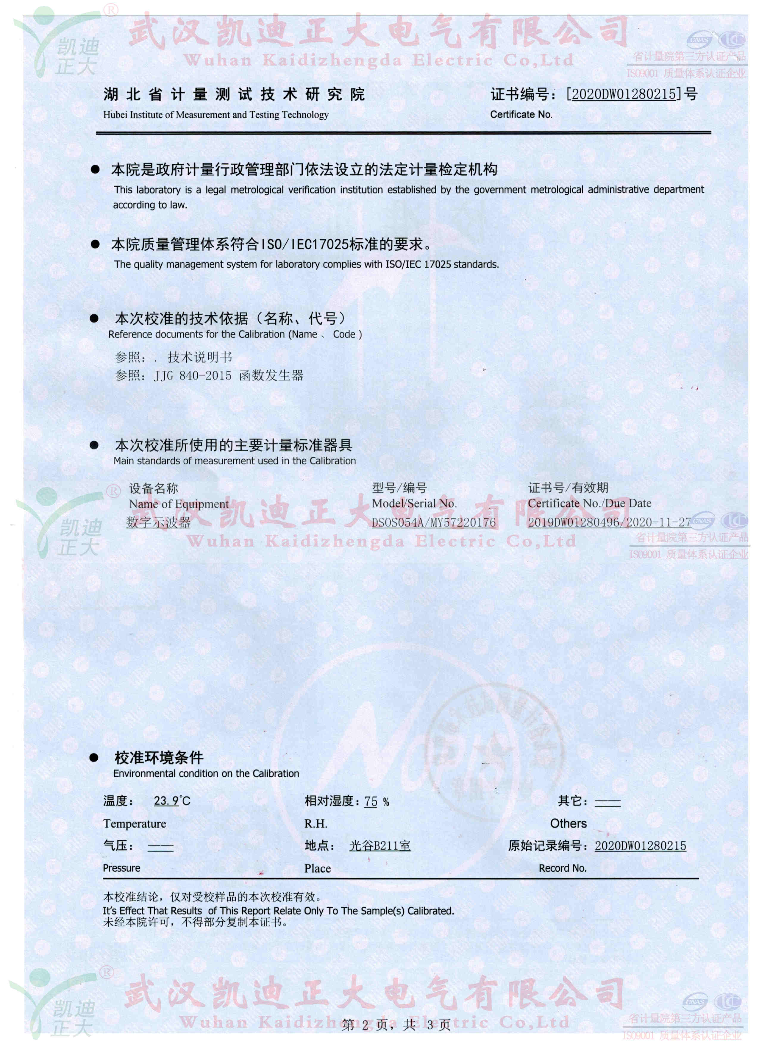 我司抽檢10套10kV配網(wǎng)單相接地故障定位儀送往湖北省計量測試技術(shù)研究院校準(zhǔn),獲得電學(xué)所檢測設(shè)備DS0S054A數(shù)字示波器標(biāo)準(zhǔn)設(shè)備的數(shù)據(jù):輸出波形正玄波、異頻信號21.598Hz、輸出電壓8.603kV、頻率測量的不確定度0.006%。符合武漢凱迪正大公司和國家電力規(guī)程標(biāo)準(zhǔn)。
