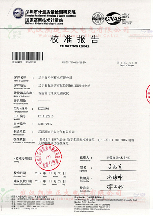 應中廣核遼寧紅沿河核電有限公司的需求,將武漢凱迪正大電氣公司生產(chǎn)的KDZD880(110V80A)智能蓄電池放電儀出具國家高新技術(shù)研究院的計量報告后才能使用。校準報告:173504097證書號,出廠編號:KD14122815,資產(chǎn)編號:500077905,校準依據(jù):參考JJF158-2016數(shù)字多用表校準規(guī)范JJF(軍工)108-2015電池充放電測試儀校準規(guī)范。嚴格出具檢定合格報告。