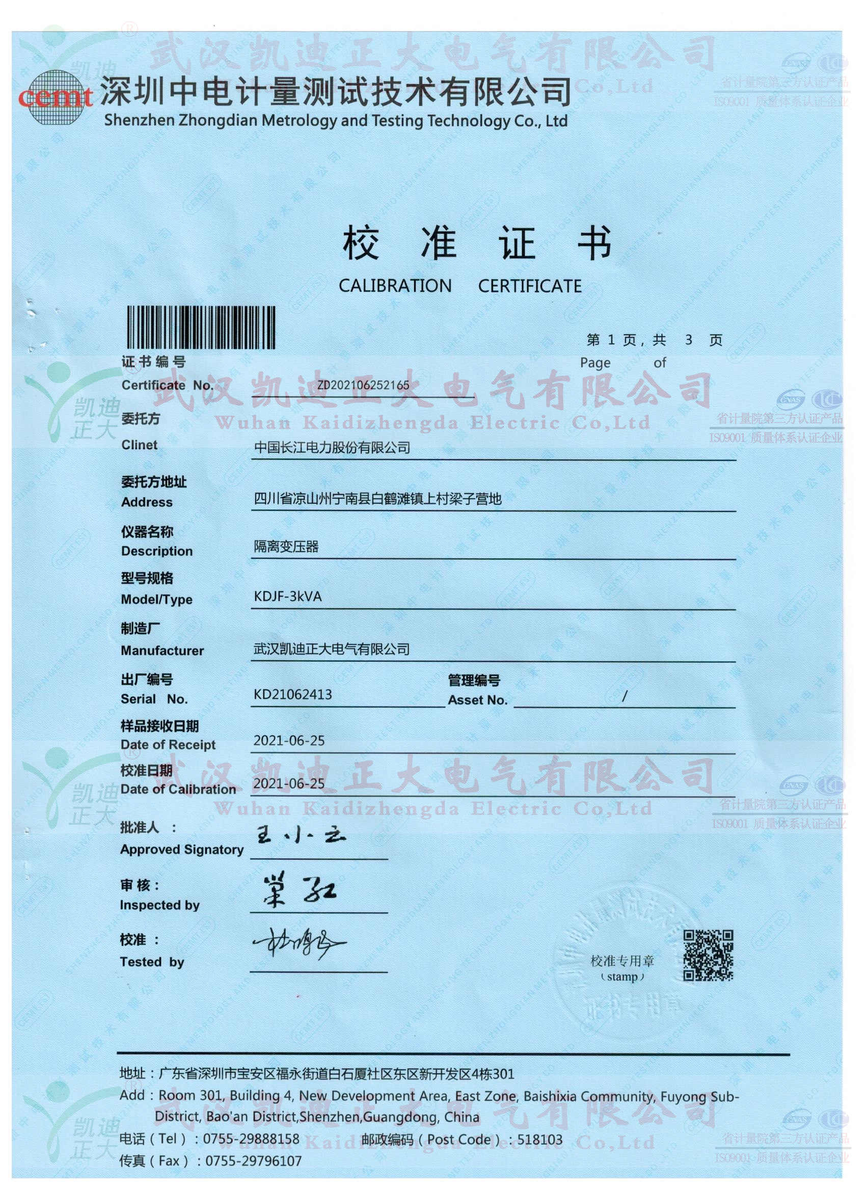 中國長江電力采購隔離變壓器獲得中電計量校準證書