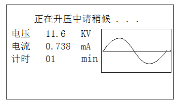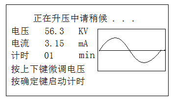自檢成功后,儀器自動進入升壓狀態(tài)。儀器將用若干個周期的時間(幾分鐘)將電壓升至設定值。在升壓過程中,按停機鍵,儀器將切斷電壓輸出,回到開始畫面。當升壓值接近設定值時出現(xiàn)圖7