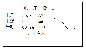 - 試驗電壓范圍為5KV至額定值。(請不要設小于5KV的試驗電壓),它規(guī)定了我們所要升至的試驗電壓。儀器升至接近這個設定電壓值時,就不再升壓,并保持在這個峰值下進行等幅的正弦波輸出。