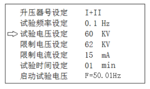 - 升壓器號設定:如果使用I號升壓器單獨升壓,升壓器號設定為I號(此時試驗電壓設定≤30KV),如果使用I號升壓器和II號升壓器串聯(lián)升壓,升壓器號設定為I+II號。