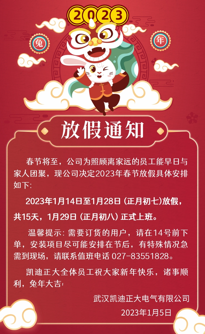 ?2023年春節將至,為使公司和員工共同度過一個歡樂、祥和、平安的新春佳節,切實做好節日期間的安全工作,現將有關事宜通知如下: