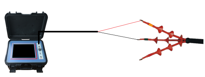 先將雙夾測試線接至(預定位儀后側(cè)板)采樣端口,再將測試線的紅夾子夾在電纜的一個好相,黑夾子夾在電纜的另一個好相。