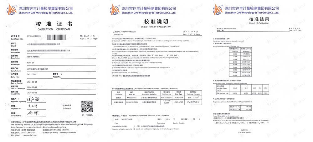 近日,山東某能源分公司采購凱迪正大電氣生產(chǎn)的KDJF-IV局部脈沖探測儀順利通過了深圳市達(dá)豐計量檢測集團(tuán)有限公司的校準(zhǔn)。