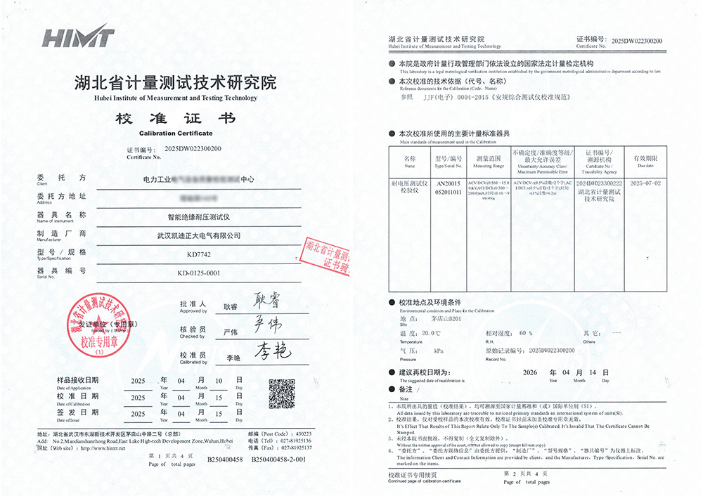 此次校準過程對KD7742智能絕緣耐壓測試儀來說是一次嚴苛的考驗。湖北省計量測試技術研究院作為計量校準機構,以其專業的技術水平和嚴謹的校準流程著稱。校準過程中,研究院對KD7742的各項性能指標進行了全面、細致的測試和評估,包括其交/直流耐壓測試、絕緣電阻測試等功能模塊的準確性和穩定性。經過一系列嚴格的測試,KD7742智能絕緣耐壓測試儀成功通過了校準,獲得了校準證書。這不僅證明了KD7742智能絕緣耐壓測試儀在設計和制造上的品質,也體現了武漢凱迪正大電氣有限公司對產品質量的嚴格把控和持續追求。