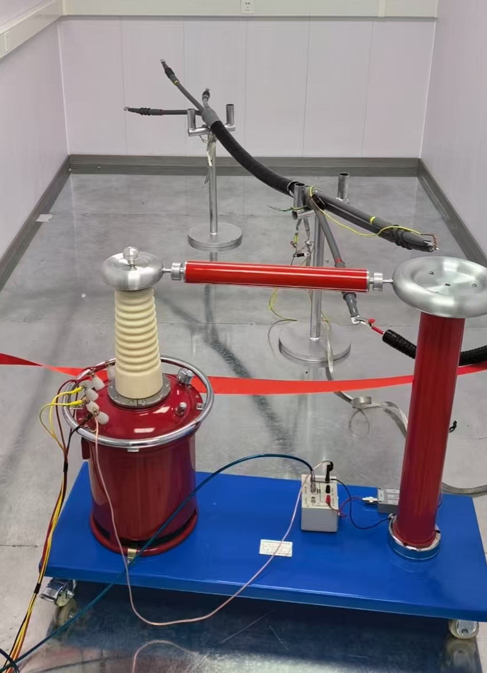 屏蔽室內(nèi)尺寸為長5米×寬4米×高2.45米,配置了電動平移屏蔽門和手動單開屏蔽門,方便人員和設備進出。室內(nèi)還安裝了通風截止波導窗和電源濾波器等設備,有效隔離了外部電磁干擾和電源干擾。同時,屏蔽室內(nèi)還配置了無電磁干擾的LED長管燈和接地系統(tǒng)等設施,為局部放電試驗提供了一個安全、舒適、可靠的測試環(huán)境。