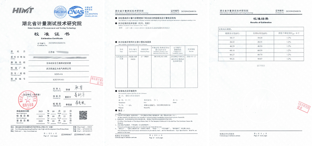 江蘇某灌溉單位采購武漢凱迪正大KDJS-8A型全自動安全工器具試驗裝置,經(jīng)湖北省計量測試技術研究院嚴格校準,取得了編號為2025DW028600156的校準證書。
