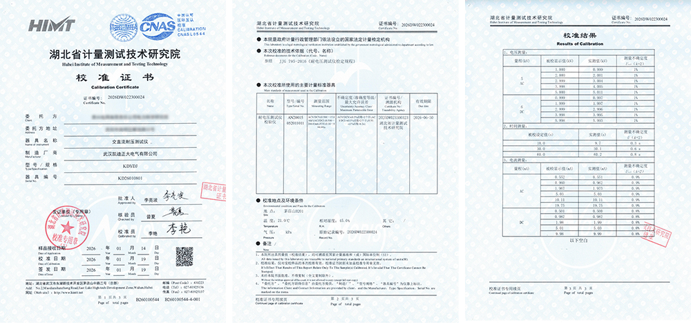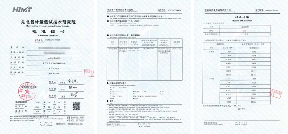 在電力系統(tǒng)的運(yùn)行維護(hù)與設(shè)備檢測中,各類專用測試儀器的準(zhǔn)確性與可靠性直接影響著電網(wǎng)安全、設(shè)備評估的科學(xué)性以及故障診斷的有效性。近期,武漢凱迪正大電氣有限公司生產(chǎn)的三款測試設(shè)備——KDCJ-20kV沖擊耐壓測試儀、KDYDJ交直流耐壓測試儀以及KD700X溫度巡檢儀,均通過了湖北省計量測試技術(shù)研究院的權(quán)威校準(zhǔn),并取得了相應(yīng)的校準(zhǔn)證書。這三份文件不僅僅是合規(guī)性的證明,更是設(shè)備技術(shù)性能的體檢報告,其校準(zhǔn)數(shù)據(jù)為我們解讀設(shè)備精度和可靠性。
