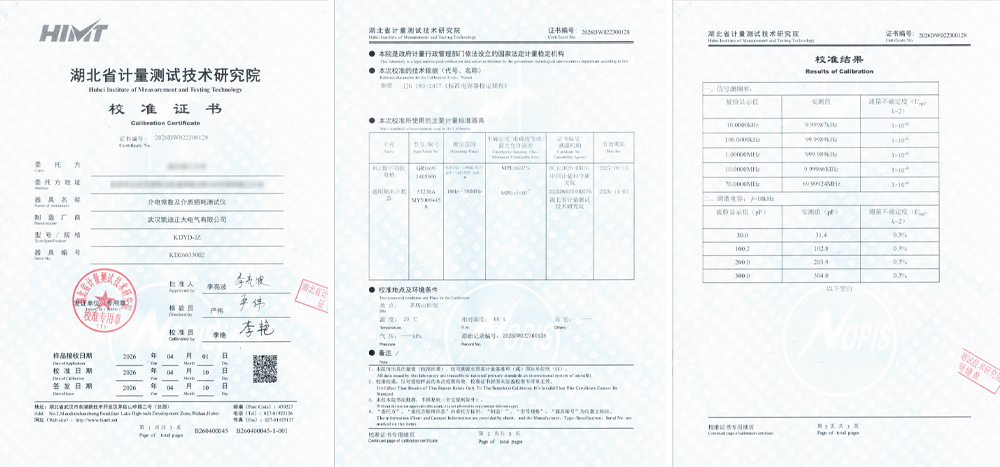 數(shù)據(jù)準(zhǔn)確是檢測(cè)儀器的生命線。為確保量值統(tǒng)一、結(jié)果可靠,KDYD-JZ 介電常數(shù)及介質(zhì)損耗測(cè)試儀已通過(guò)湖北省計(jì)量測(cè)試技術(shù)研究院嚴(yán)格校準(zhǔn),證書(shū)編號(hào):2026DW022300128。本次校準(zhǔn)依據(jù) JJG183-2017《標(biāo)準(zhǔn)電容器檢定規(guī)程》實(shí)施,采用中國(guó)計(jì)量科學(xué)研究院溯源的 RLC 數(shù)字阻抗電橋與高精度頻率計(jì)數(shù)器作為標(biāo)準(zhǔn)器具,環(huán)境溫度 20℃、相對(duì)濕度 60%,校準(zhǔn)條件規(guī)范可控。校準(zhǔn)結(jié)果顯示,儀器在 10.0000kHz 至 70.0000MHz 頻率點(diǎn)顯示值與實(shí)測(cè)值高度吻合,相對(duì)不確定度達(dá) 3×10??(k=2);調(diào)諧電容各點(diǎn)誤差≤0.3%,關(guān)鍵指標(biāo)均滿足技術(shù)要求,量值可直接溯源至國(guó)家計(jì)量基準(zhǔn)與國(guó)際單位制(SI),校準(zhǔn)結(jié)果僅對(duì)本次送檢樣品有效,具備官方效力與法律效力。